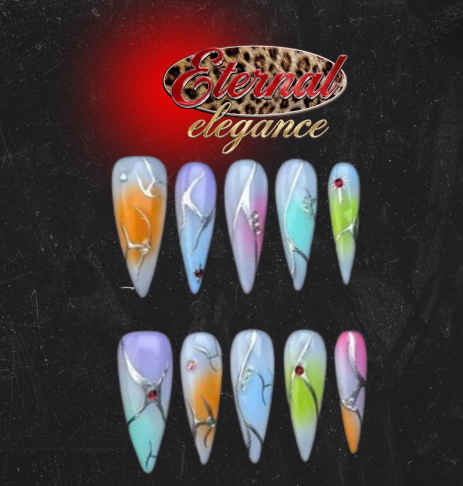 Pastel ombré nail set, featuring a soft blend of dreamy colors including peach, lavender, aqua, mint, and pink. Each nail is detailed with hand‑painted silver abstract line work