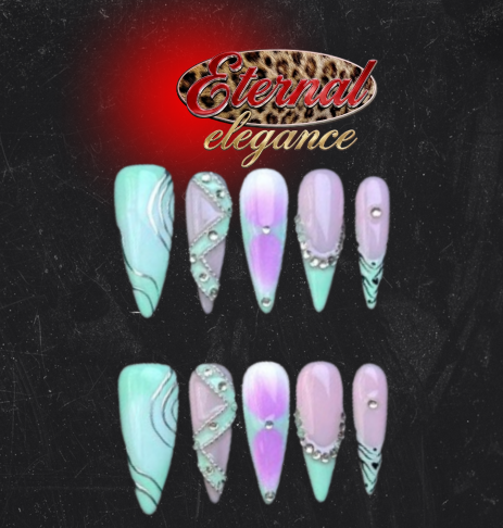 The nails feature a blend of mint green and lilac ombré, paired with shimmering iridescent purple accents. Elegant silver swirl linework and crystal‑studded curves