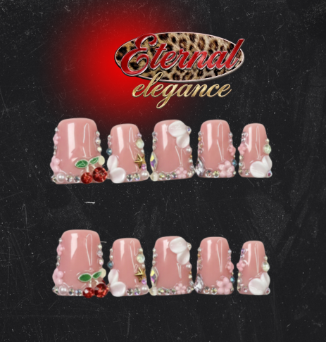 Nail set is a soft a blush pink base coated in ultra glossy shine and adorned with delicate 3D embellishments. Each nail features a curated mix of pearls, petite florals, rhinestones, heart charms, metallic studs, and gemstone accents